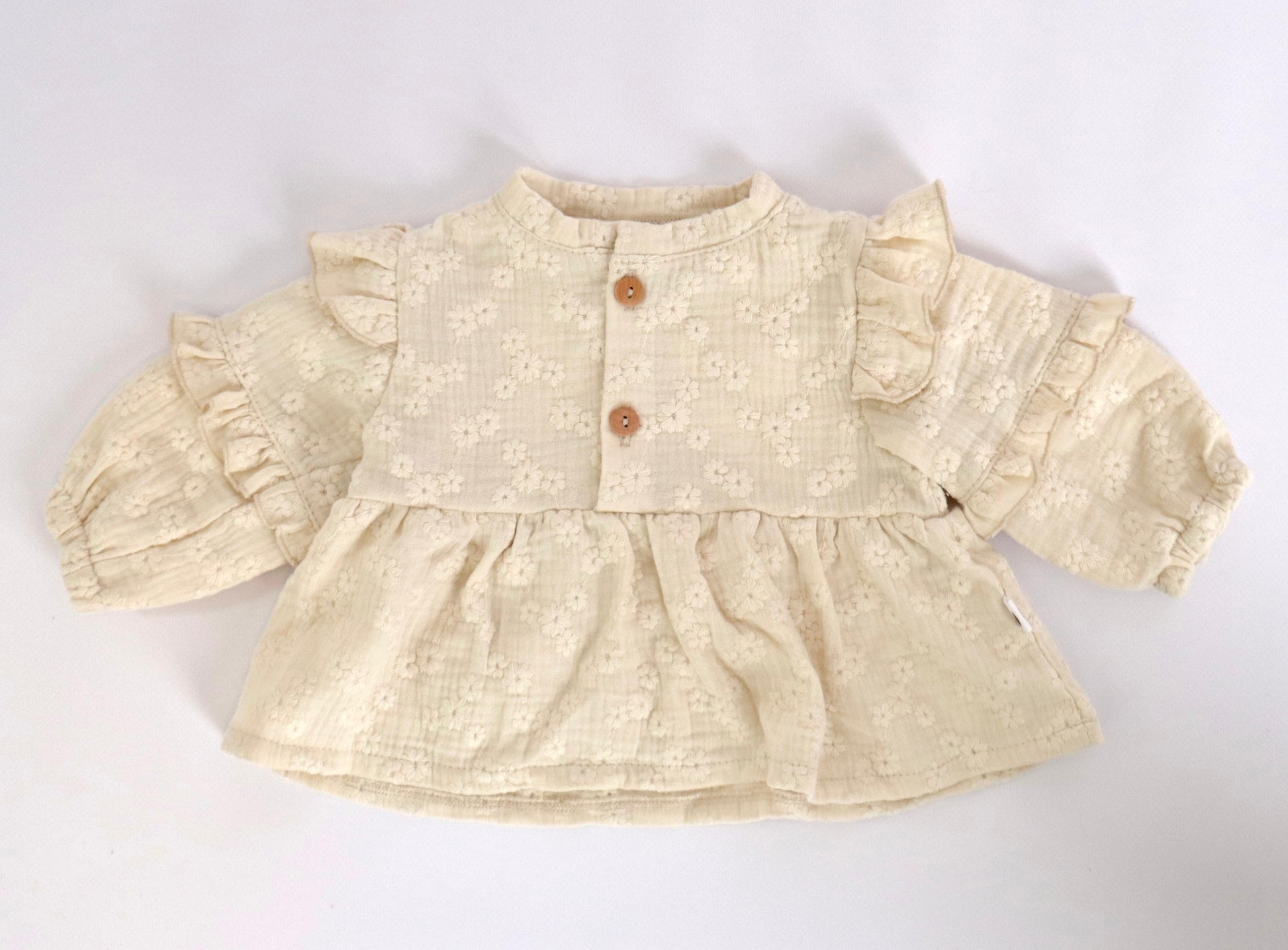Laat je kleintje stralen in deze schattige blouse met ruffels. De blouse is gemaakt van zachte hydrofiel katoen in de kleur beige en voorzien van een knoopsluiting aan de voorkant.
